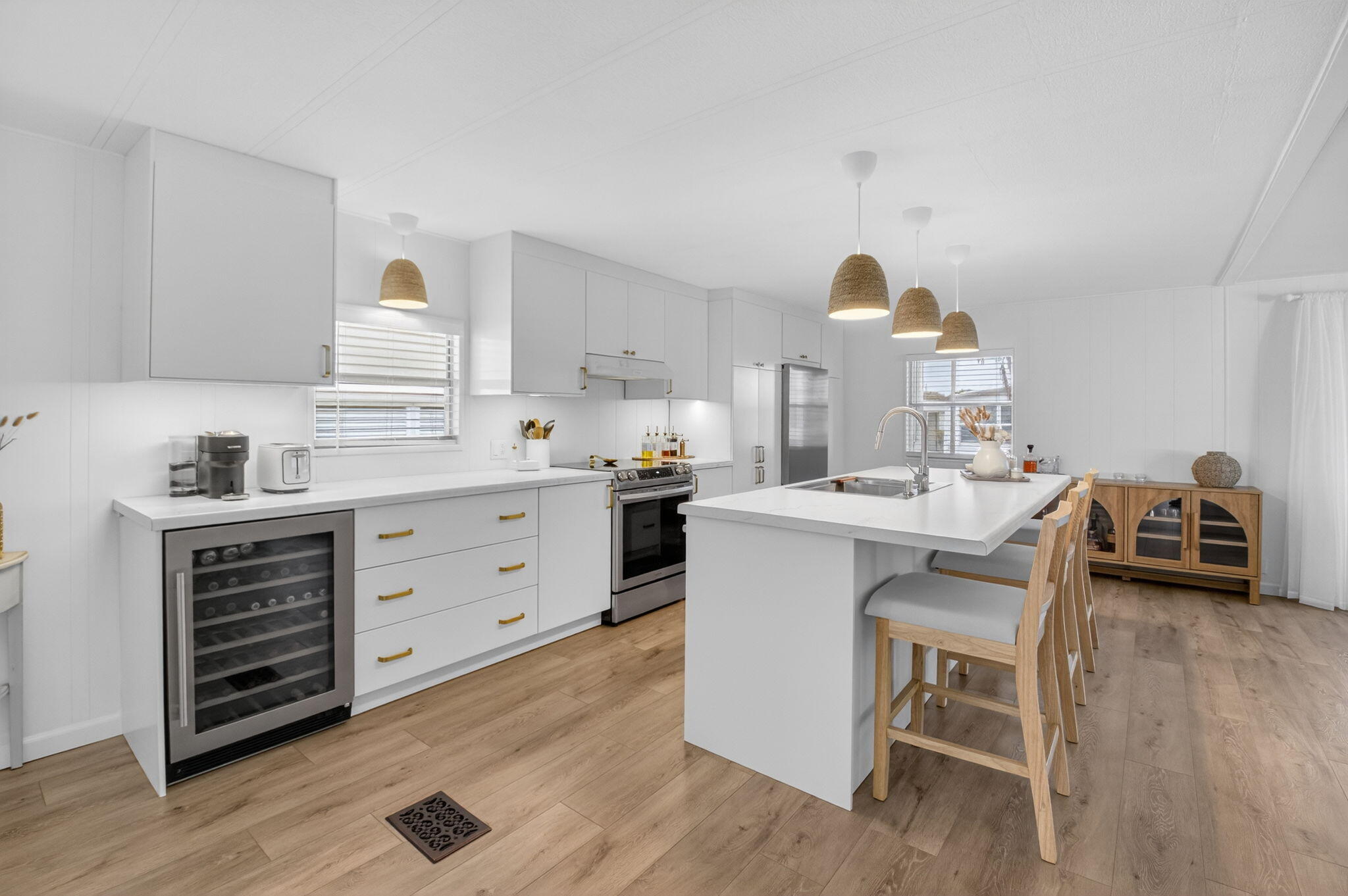 DescriptionNO LAND LEASE!!! Completely TURNKEY! This beautiful COMPLETELY UPDATED 2/2 is a showstopper! Whole house has luxury laminate flooring throughout. Kitchen has NEW APPLIANCES with a wine fridge. Under cabinet lighting, NEW cabinets and NEW countertops! OPEN concept kitchen with a SPACIOUS island perfect for entertaining! Patio has OVERSIZED glass windows and new flooring! BOTH bathrooms completely remodeled! Home is OPEN, AIRY and shows like a model home! Offered beautifully furnished excluding art and personal items! Jamaica Bay is a desirable 55+ community with multiple heated pools, clubhouse, billiards, shuffleboard, pickleball, library, social activities and a new onsite convenience store! The HOA includes lawn care, water, internet, sewer, trash and 24/7 manned gate
